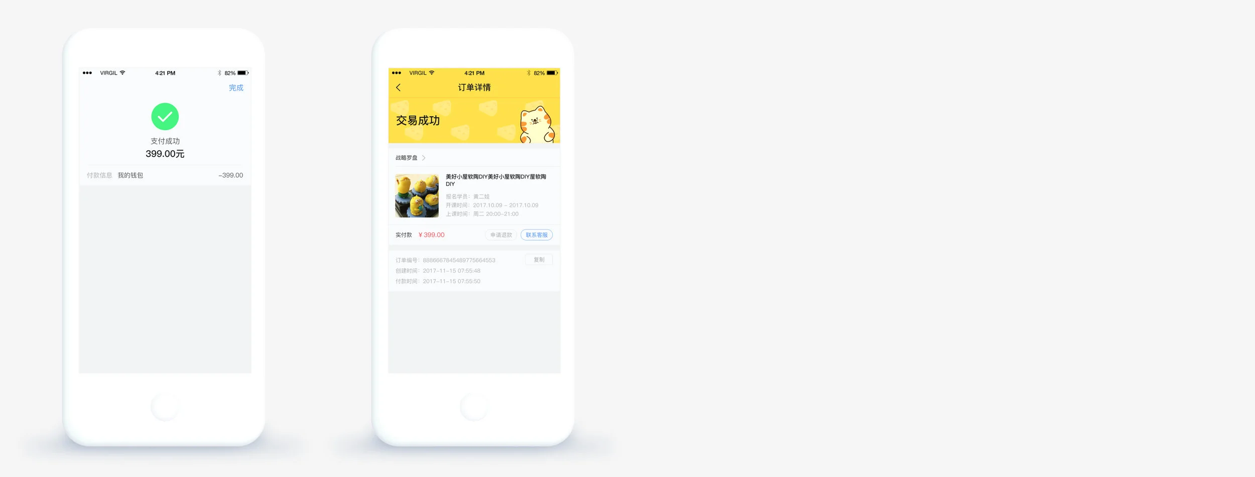 課程表頁面可以查看各學員的課程情況,及上課狀況,且能在左上角的位置切換學員,如果用戶有多位學員,當前日期為橘黃漸變,如想查看其他天的課程安排,可點擊任一日期即可,點擊的日期將變為橘黃漸變,當日日期則將變為灰色,點擊右上角的”今天“,便可快速回到當日。每點擊一個日期,下列表會顯示該天課程的相關信息,如當前為課程正在進行中,用戶便可觀看孩子的上課情況,這在我們的用戶調查中發現這功能極為重要,大部分家長都很關心孩子們的上課狀況。