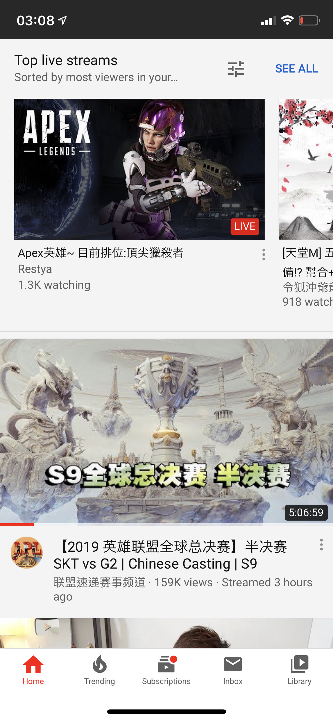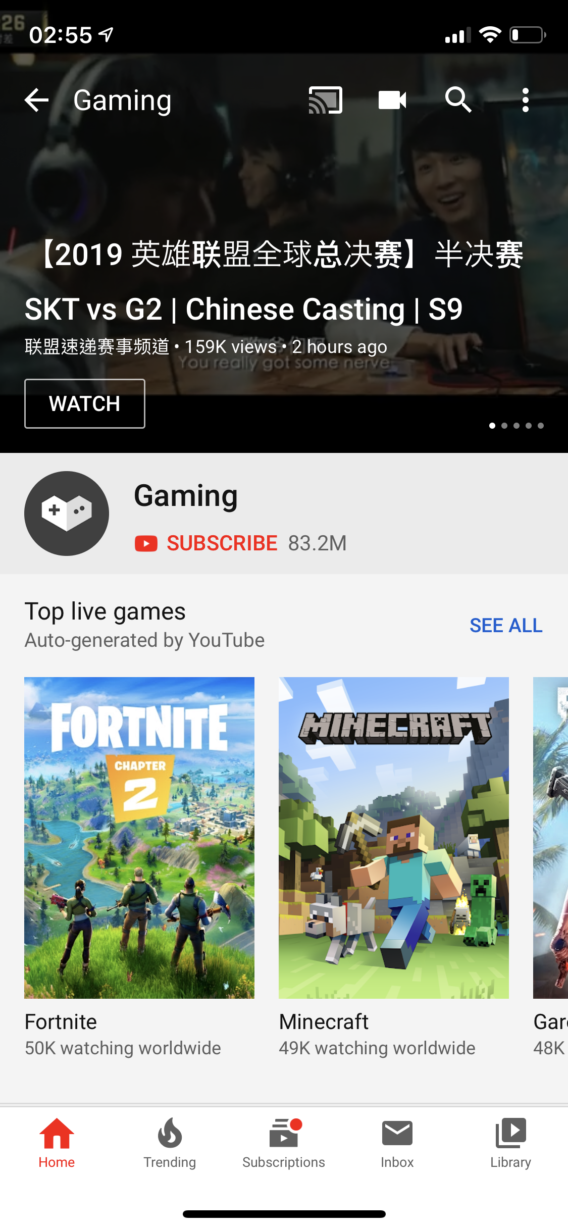 Gaming屬於Youtube頻道之一,所以在界面框架上,他的邏輯是在頻道中在選取想觀看的直播或影片,框架上的佈局就較為繁雜一些,頂部按鈕位置用戶可以直接連結設備、直播/上傳影片、搜索等功能,這與一般的直播平台較為不一樣,直播按鈕容易被尋找到,但是其實直播是有門檻的,並不是任何人都能直播,必須訂閱人數達1000人以上才可開啟移動端的直播功能。整體頁面的佈局中規中矩,但以頻道的方式呈現,所以在內容展示上除了top live games有分類以外,其餘推薦影片就以隨機方式分佈在頁面中,上圖下字佈局的方式。