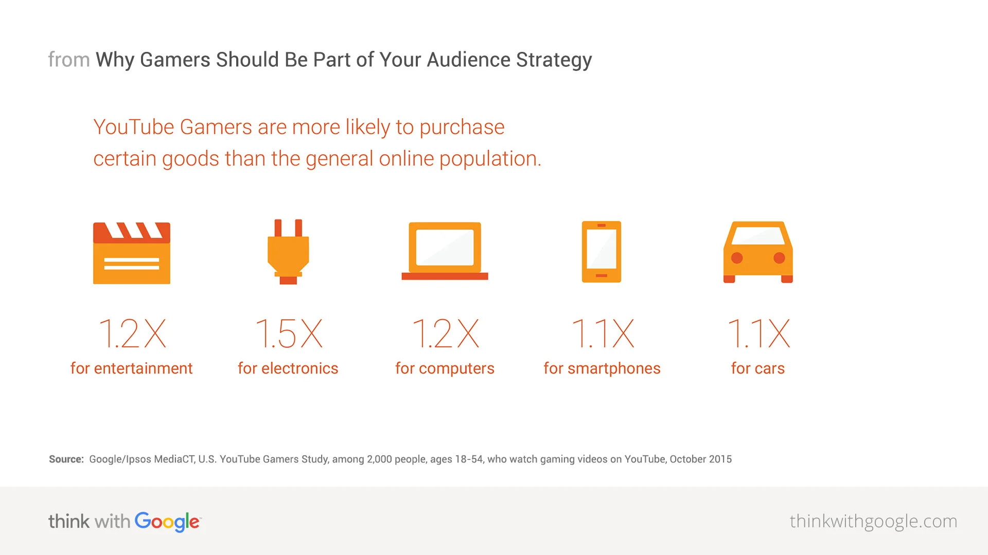 YouTube遊戲頻道不僅是吸引18-34歲的男性,而且在吸引女性方面也非常有效。根據ESA的2015年報告,成年女性現在玩遊戲的比例要高於男性。YouTube的數據還發現,女性觀看人數每年都已倍增的方式增加著,並且代表了遊戲行業的增長比例,從而證實了這是一個趨勢。在2014年comScore報告中,觀看StyleHaul(專門的YouTube時尚和美容頻道)的女性中有40%也在YouTube遊戲頻道上觀看遊戲內容。YouTube遊戲玩家不僅更有購買某些產品的能力,而且更有可能購買高級產品。例如,接受調查的YouTube遊戲玩家中有74%的人表示,他們將願意為高質量的媒體、娛樂產品和服務支付更高的價格。85%的人表示,他們願意為優質的電子產品和服務支付更高的價格。73%的人則對優質食品和飲料產品及服務發表了相同的意見。