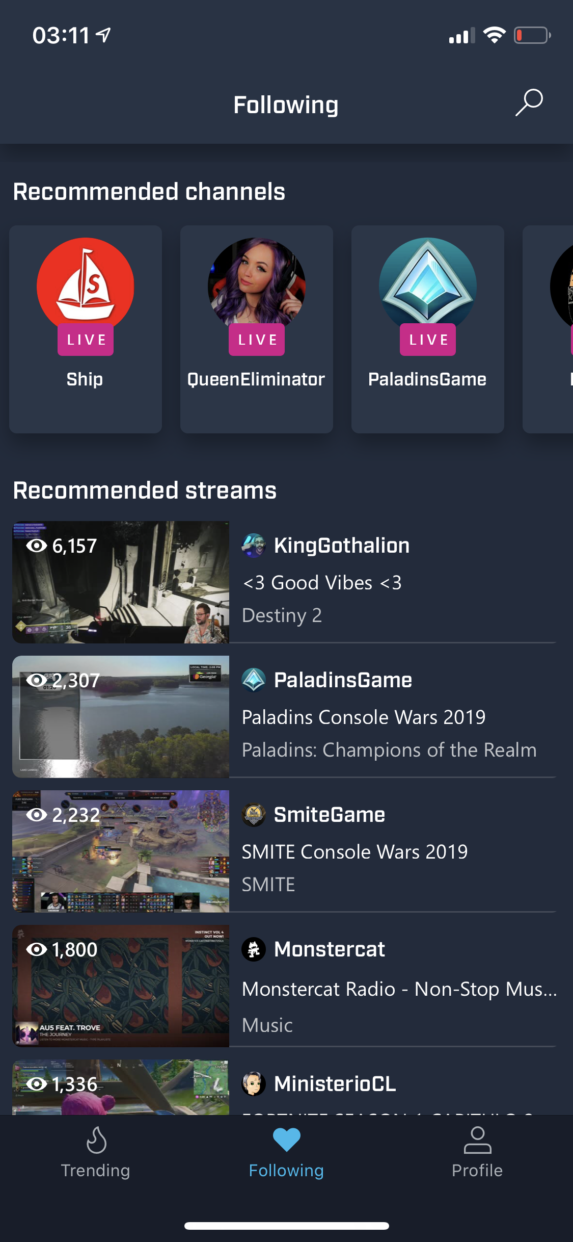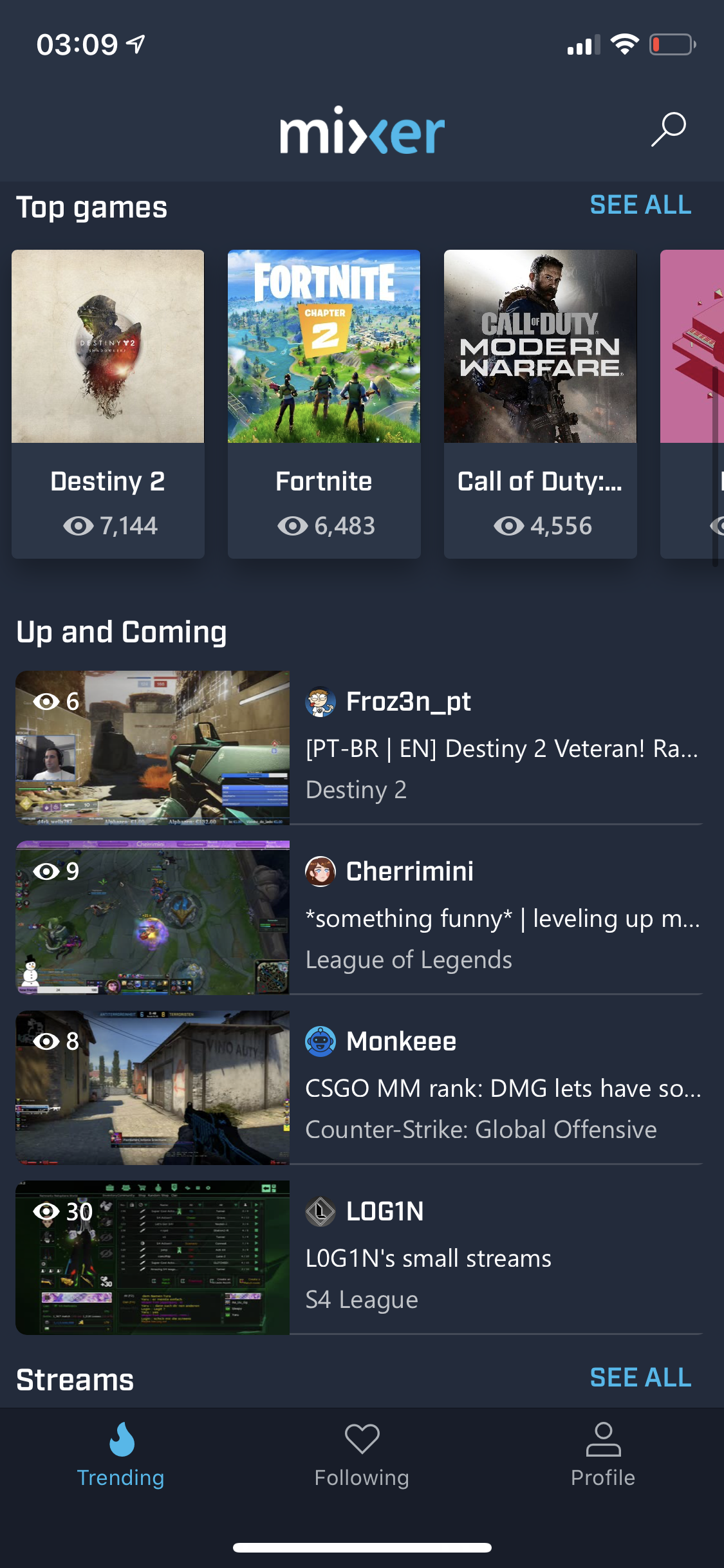主要在於推薦正在直播的實況主,所以在這個頁面中,可以看到Live用了亮顯標籤,以增加辨識度。Mixer與Twitch在推薦直播的列表上,呈現的佈局樣式是大同小異的。