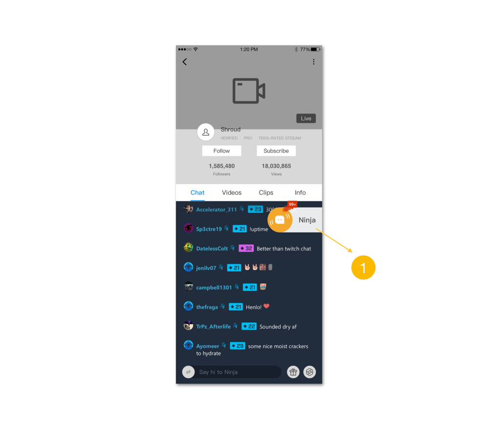 ・這個提示為某一直播間的直播主(Ninja)可能有狂刷屏的信息出現,如用戶好奇也可點擊跳轉進入觀看。