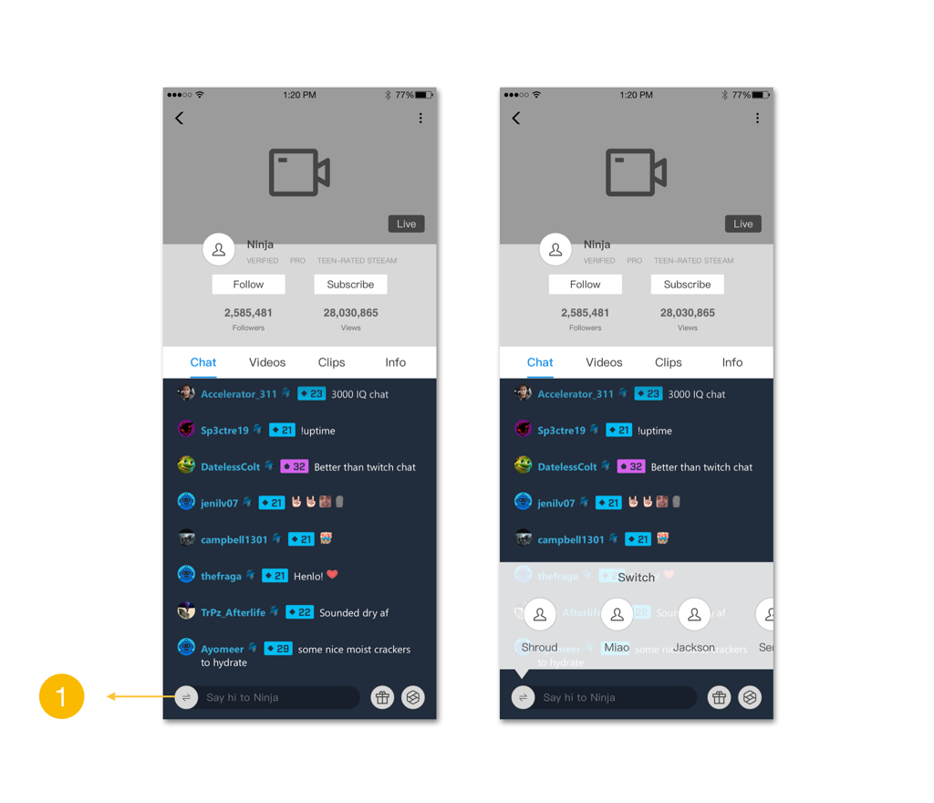 觀眾用戶可透過聊天室與實況主進行互動,發送文字及系統自帶的表情符號