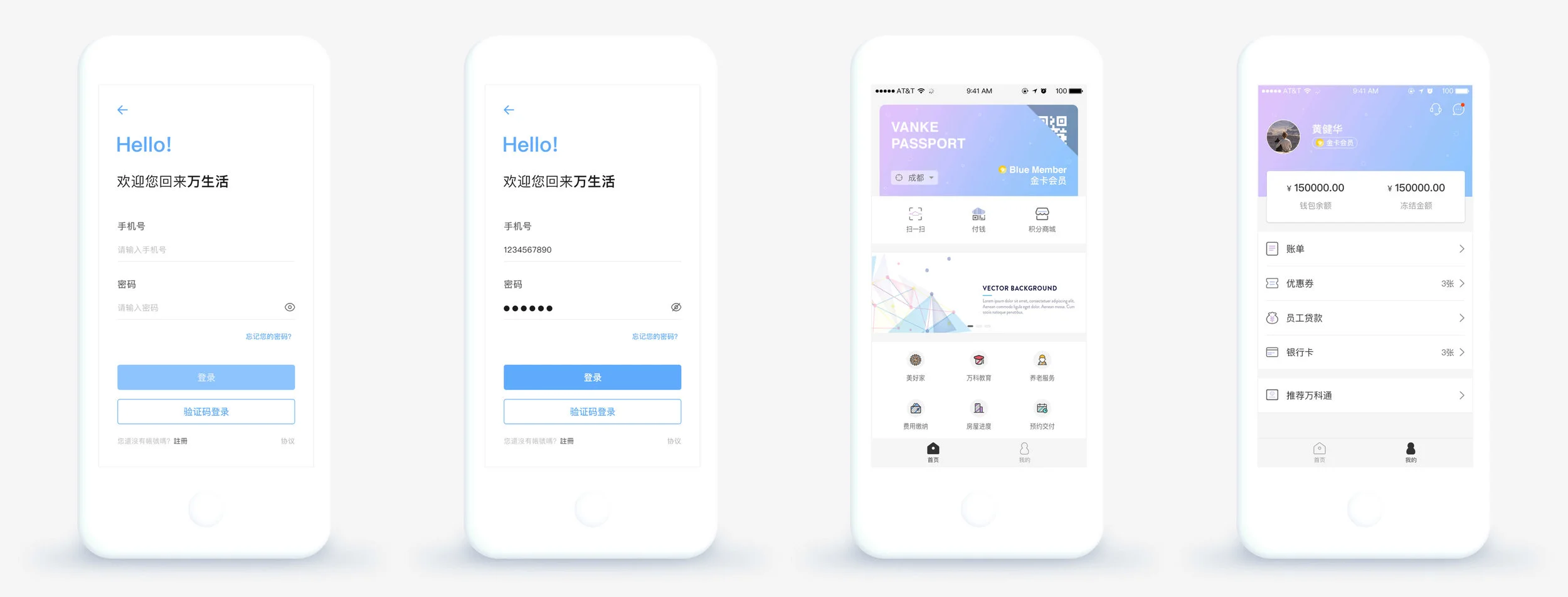 我們依據著在案場調研及測試的分析結果,因需求為功能性需求,且需較高安全性,所以我們在界面上的設計希望的是簡潔並且顏色上的選擇是給予用戶安心的用色,在安全上也有著銀行作為第三方的監管,使得用戶在存管的同時也能多加保障,佈局上的編排,由於定位在功能性的應用,所以我們將流程盡可能的簡化,讓用戶能依序步驟安排完成目的,顏色上我們主色調為藍色,藍色有著安全的意旨,首頁的設計,由於万生活的定位,後期規劃為與生活更加貼切,所以我們使用了較為活潑的icon作為點綴,增添些許樂趣,與多業態的合作也使其應用更加豐富完整。