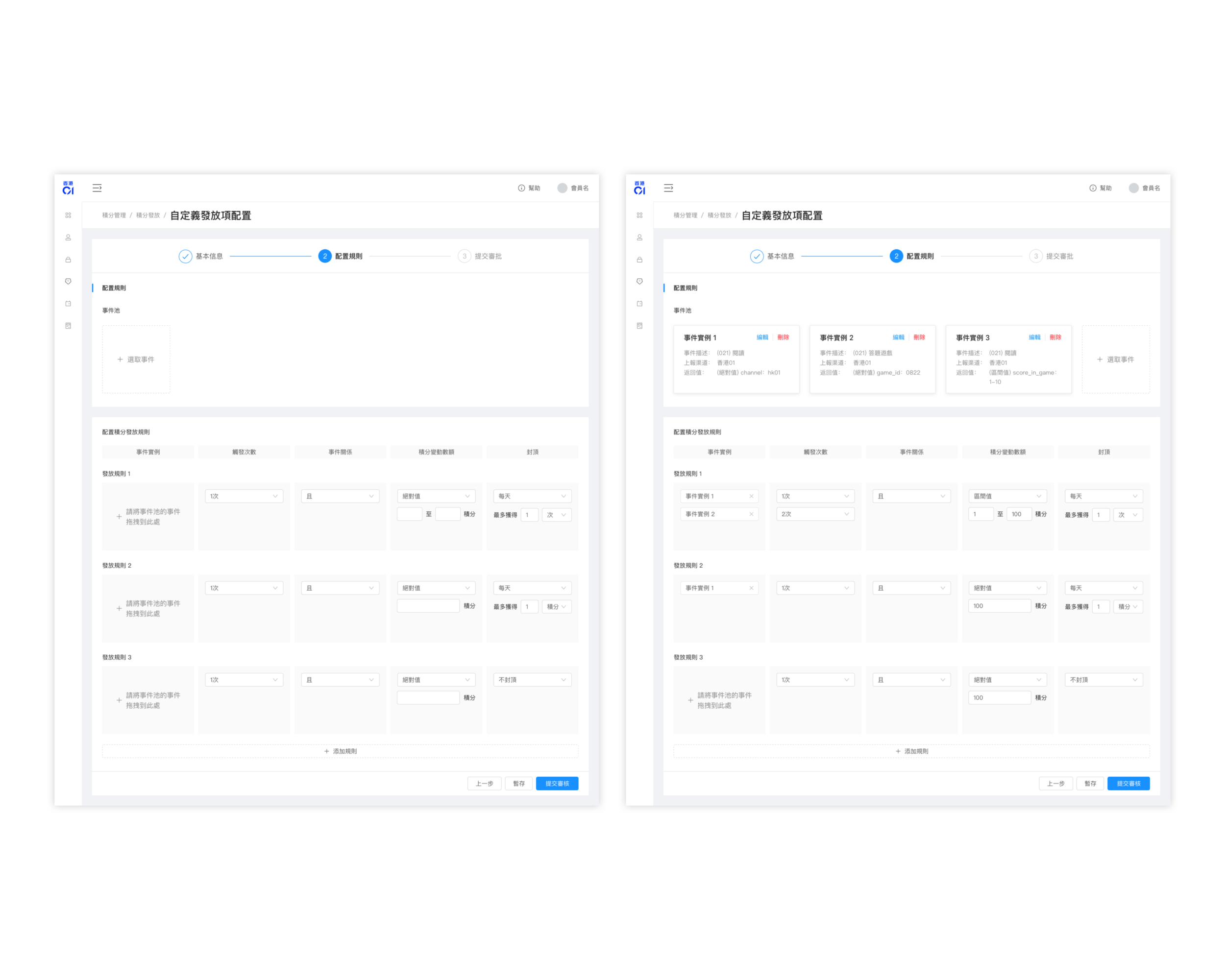 在提交測試時,積分方面的配置,也因為用語方面不同的詞彙用語面臨了一大挑戰,配置上的功能繁瑣也造成操作上有些複雜,所以雙方團隊組織了一次演練會議,各相關部組接派代表們進行用戶體驗,同時流程相關的內容也再次演練。雖在設計時已盡量將繁瑣的功能進行簡化,但在實操時還是有些不便利,所以在會後對於操作再次進行了優化。由於配置/派送/審批積分需各相關部門一同執行,所以還需要在設計完後,再次進行體驗測試。 B 端後台項目本就需要有點教育學習成本的存在,但交互要如果盡可能的調整到用戶所方便使用的情況下,那就不需要花費太多時間在學習系統操作上,能夠快速上手,且積分攸關於金錢,所以也需要多加注意細節,不容一絲馬虎。