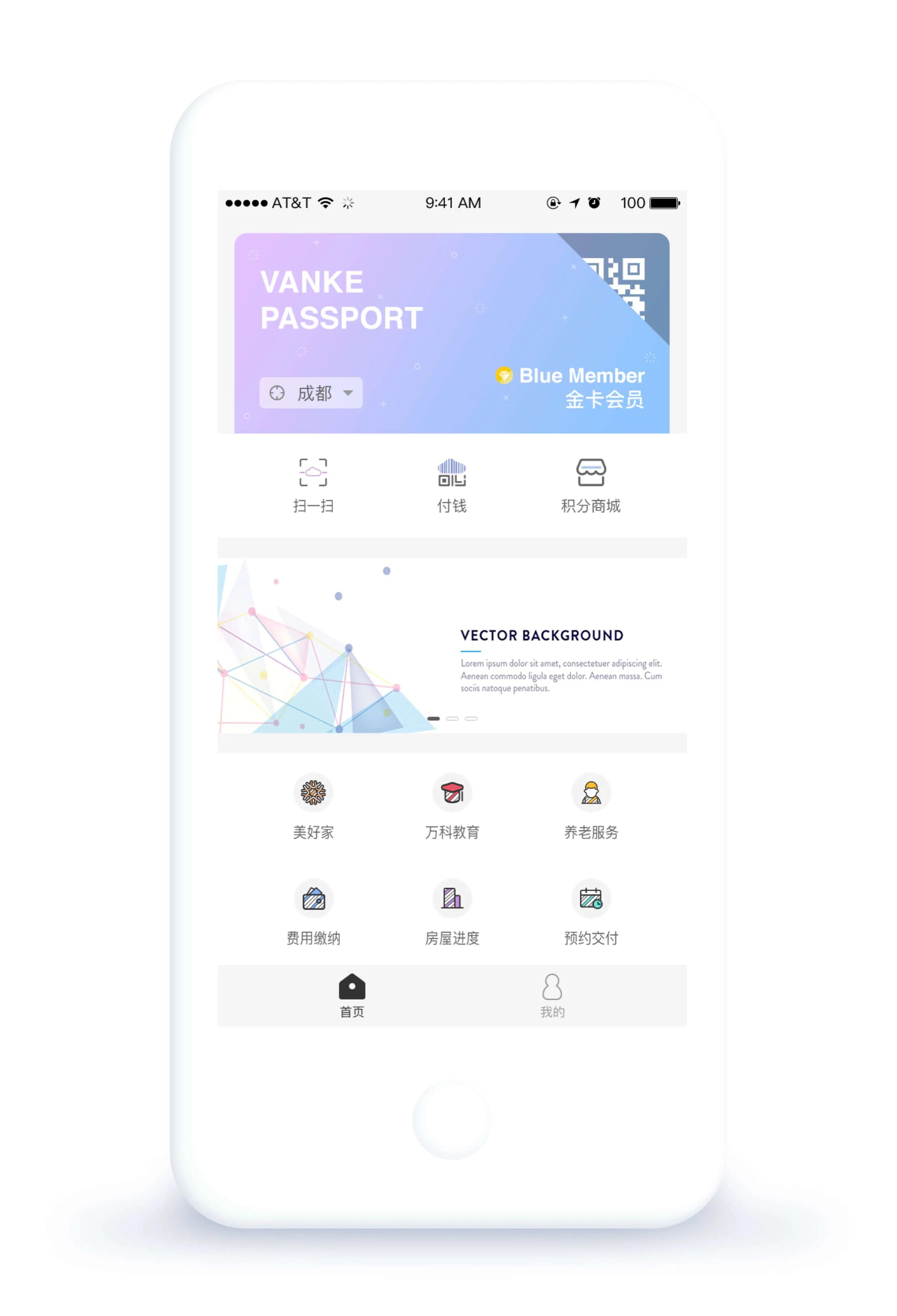 首頁採用與一般市面上不同的設計方式,頂部為卡片式的呈現方式,原因在於右上角有個二維碼掃描功能,用戶點擊後,會有彈窗彈出顯示您的二維碼信息,二維碼信息為用戶的個人信息,當用戶進入案場時,經紀人或者置業顧問可透過掃描用戶二維碼獲得客戶信息。卡片會根據會員等級進行顏色的變換,目前會員有三個等級-普通會員(藍卡會員)、(金卡會員)、(鉑金卡會員)。再者,為三個功能選項,下面則為廣告Banner,呈現方式由各城市公司自行配置,最後一欄為附加功能項,這集合了公司當前的所有與線上相關之業務入口,用戶可透過不同的需求進行點擊您所需要的服務。