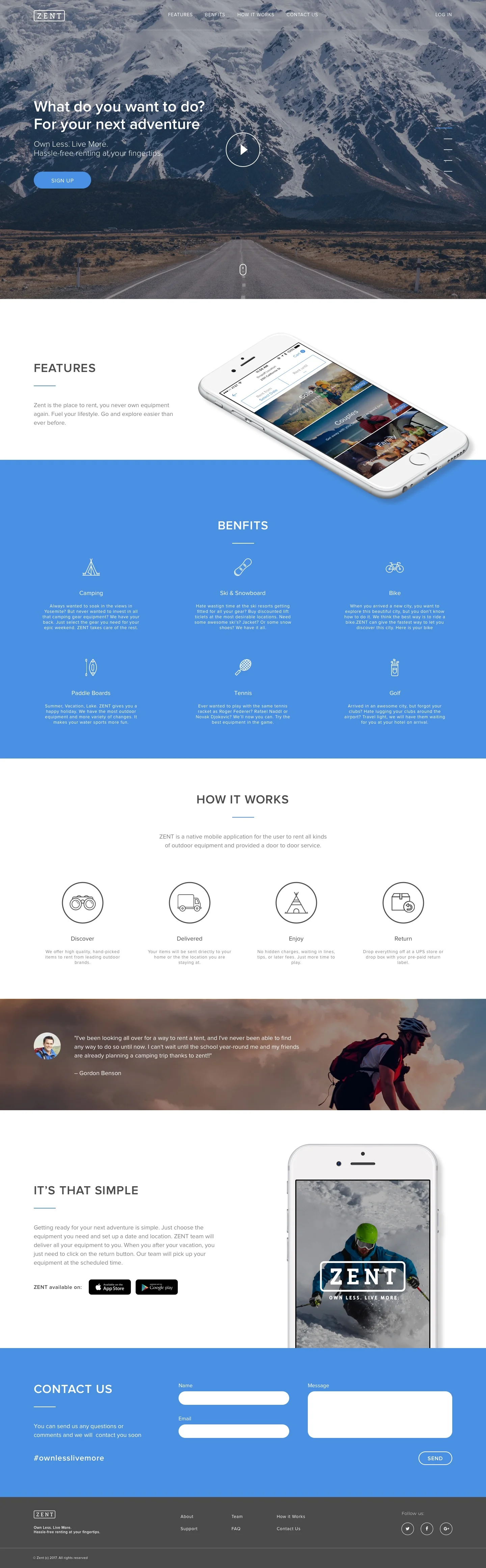 ZENT是一個原生的移動應用程序,用戶可以租借各種戶外配備用品,且不管租借與歸還都能上門送貨/取貨。想要準備一次冒險旅行是很簡單容易的!只要用戶選擇使用 ZENT,選擇您想出發的日子,就可以輕鬆出門!