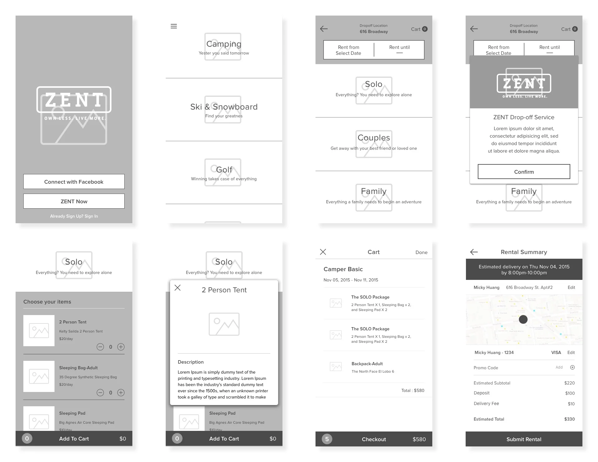 ZENT設計一個移動應用程序,讓用戶能透過平台快速且輕鬆得租用戶外設備,且送貨到府的服務,此外,用戶還可以訂定歸還設備時間且預約UPS上門取貨,這對用戶來說是更加便利的。設計上,採用清晰明瞭的信息呈現,我們將活動分類,用戶可以擁有個性化的選擇設備,也可選擇平台已幫您配置好的物品進行承租,所以我們設計的分類方式,可讓用戶更加便利的選擇租賃,所有的下單進度,也可在APP中查詢得到。歸還流程,我們也設計達到一鍵歸還,不需要用戶自行拿去歸還或者去快遞公司寄回,預約時間會有UPS上門收件。