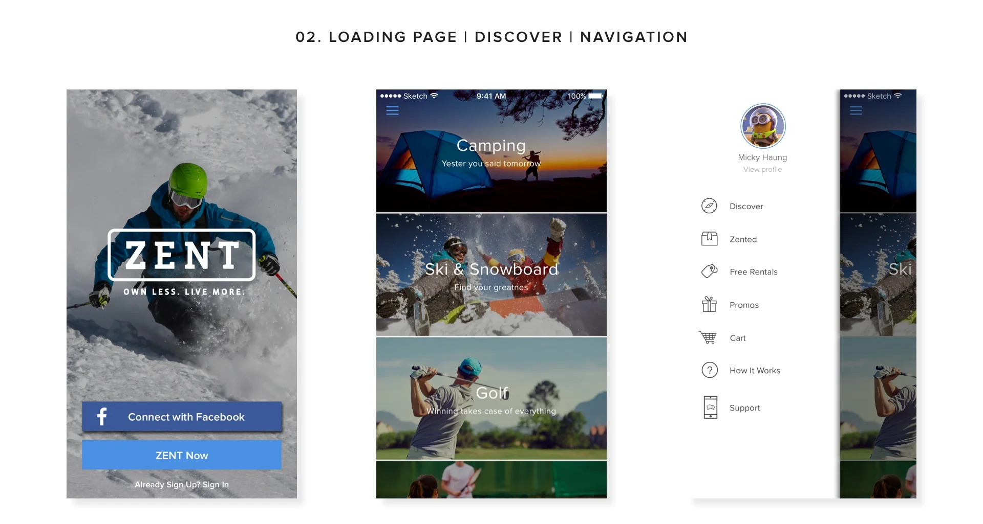 導航的內容有可查看用戶資料及快速進到某些分類功能裡 (ZENT Discover, Zented, Free Rentals, Promos, Cart, How is works, and Support) ,我們採用了文字與圖標做搭配,圖標不僅增添辨識度,也使得畫面更加有趣,不至於都是文字,看起來就會比較呆板,且只有文字的排列將不太清晰可見目標物。