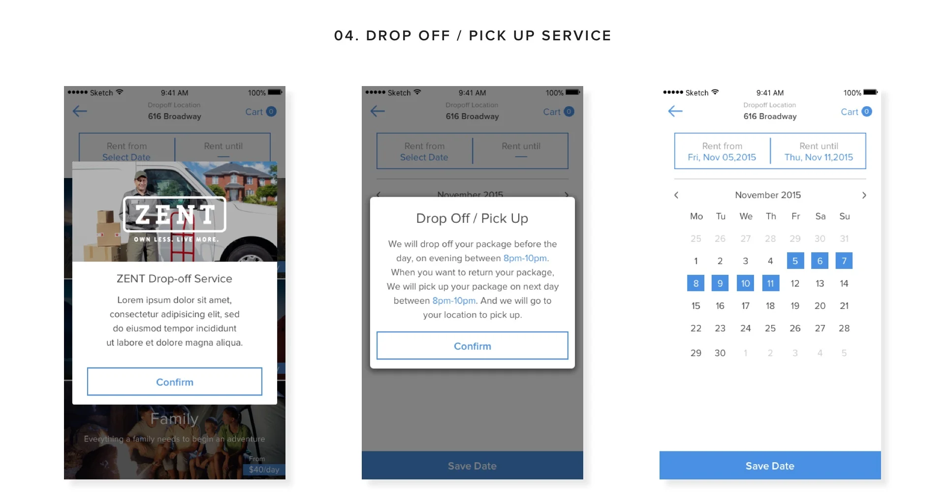 ZENT 提供送貨上門及到府取件,這對用戶來說既節省時間也不佔用存放空間,我們從調研中發現,戶外用品的存放對於用戶來說造成極大的困擾,因都市裡的不管出租房或自有房,空間利用事需要特別精准的,但戶外配備的存放是需要佔據大量空間且需占用時間的比例也是較大的,這樣在屋內的動線就會受到阻礙,所以住在城市又愛戶外運動的人們,總是苦惱存放問題,基於這個需求,我們設計了 ZENT 來解決這惱人的問題,我們送貨上門的時間在晚間八點到十點之間,這是大部分上班族回到家的時間,可以解決白天不在家無人收貨的困擾,另一方面,我們將在用戶出發前一天將物品送上門,這對存放時間及位置提供了解決方式,這樣用戶可以節省掉擺放空間及時間,當用戶承租完畢後,我們也會在隔天的晚間八點到十點之間到府取貨歸還,這也可節省上班族忙碌的生活,省去來回到承租店家的路程及租還需要耗費的時間。